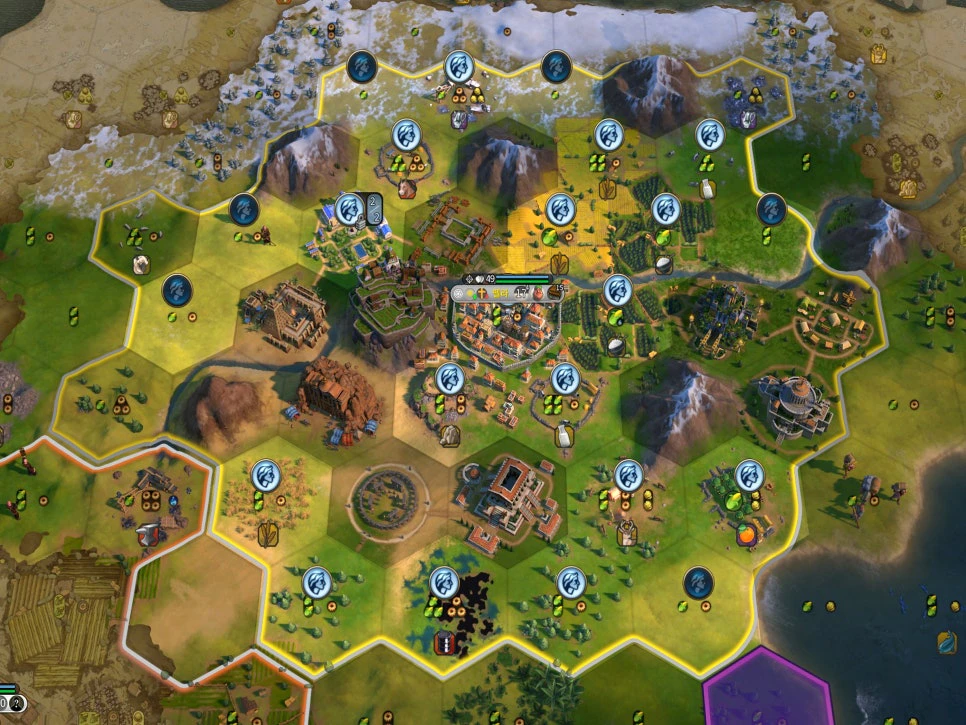 각 도시는 시민의 수에 따라 최대 36개의 타일에 작업자를 배치할 수 있습니다. 또한 플레이어가 직접 식량, 생산량, 금, 신앙, 과학, 문화 중에 가치가 있는 부지를 선택할 수 있습니다.