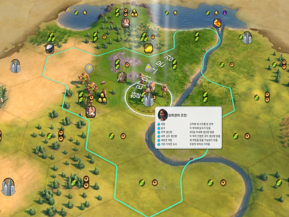 게임 초반에는 개척자를 통해 도시를 넓히는 것이 중요합니다. 따라서 첫 도시는 주변 타일을 분석하고, 가장 적합한 곳에 지어야 됩니다. 만약 주변 전략 자원 타일과 생산력을 직접 파악하는 게 어렵다면, '보좌관의 조언' 메시지를 활용하는 것이 유용합니다.