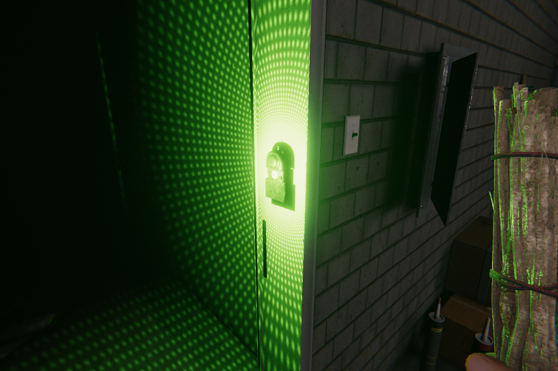 도트 프로젝터는 키보드 'F'로 바닥, 벽면 모두 설치가 가능하며, 사진처럼 녹색 빛이 원형으로 퍼져나가는 모습이 특징입니다. 의외로 빛의 범위가 넓고, 주변 시야를 밝혀주기 때문에 양초를 대신해서 활용할 때도 있습니다.