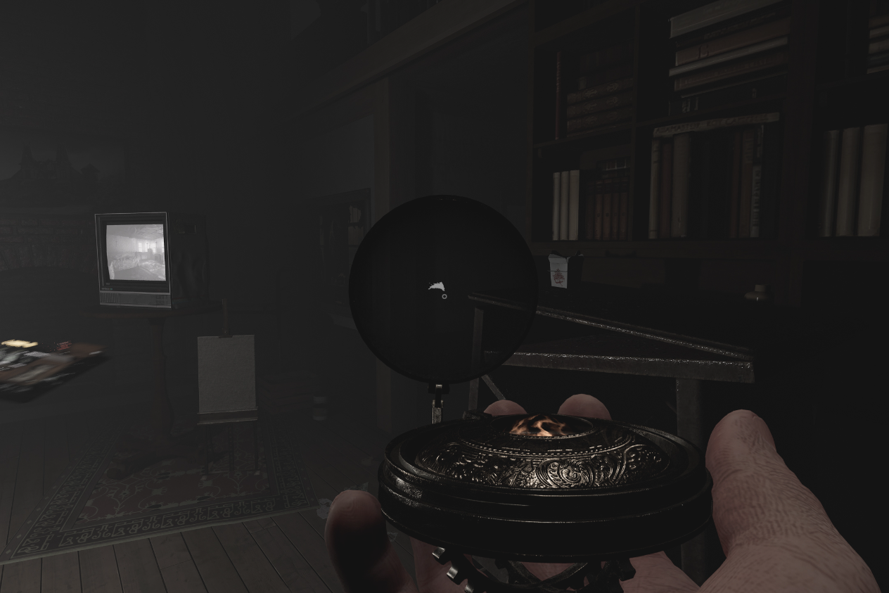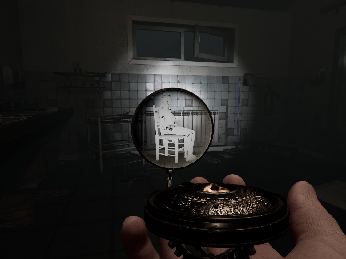 마우스 오른쪽을 꾹 누르고 있으면, 손에 들고 있던 엑토 글라스(Ecto glass)의 시야가 확대됩니다. 이때 엑토 글라스는 마치 나침반의 모양을 하고 있는 장비이며, 정면에 엑토플라즘 얼룩이 감지되면, 해당 얼룩이 흰색으로 반짝이게 됩니다.