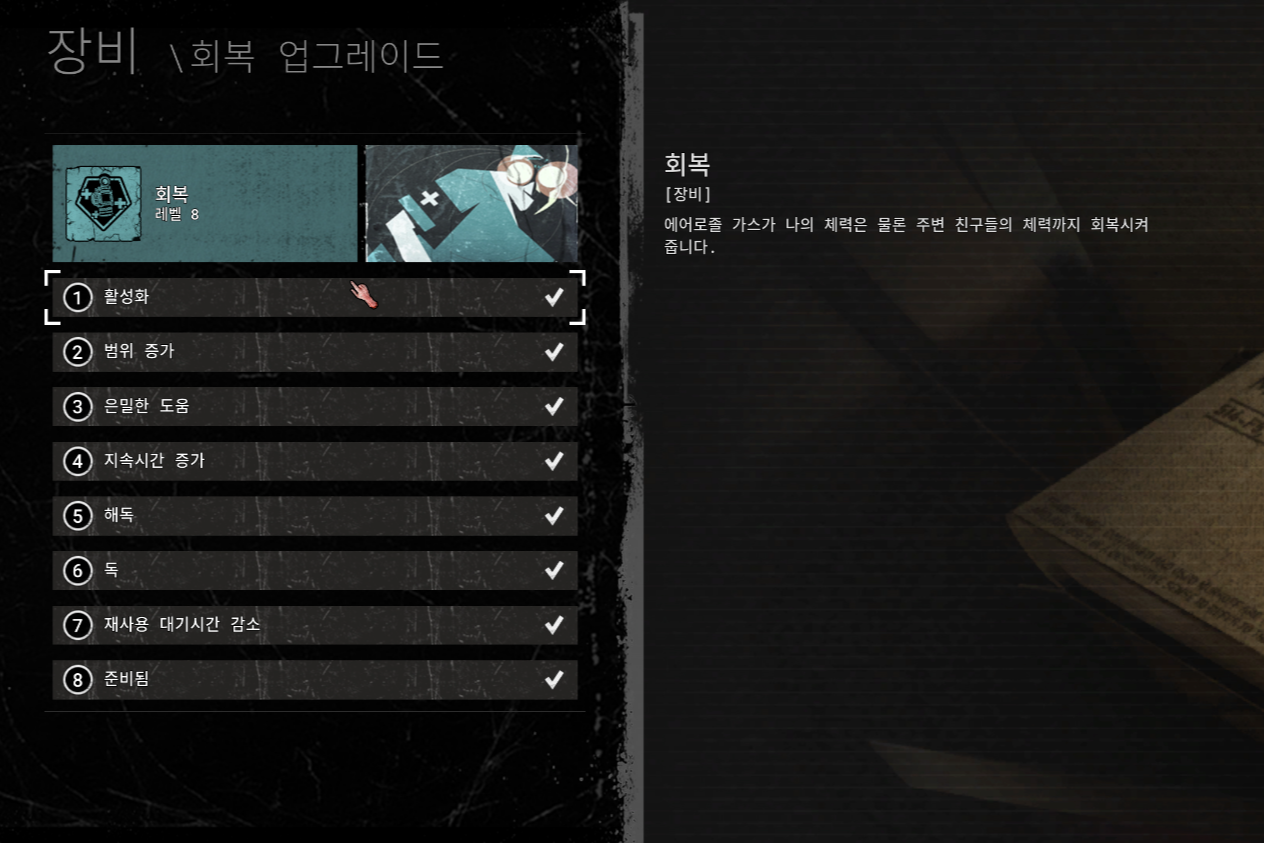 ① 활성화 : 에어로졸 가스가 자신과 팀원 체력 모두 회복.