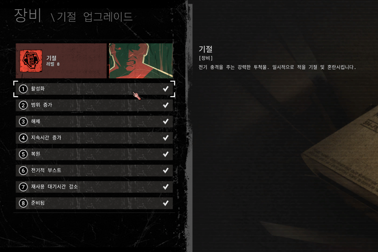 ① 활성화 : 전기 충격을 주는 강력한 투척물. 일시적으로 적을 기절 및 혼란.