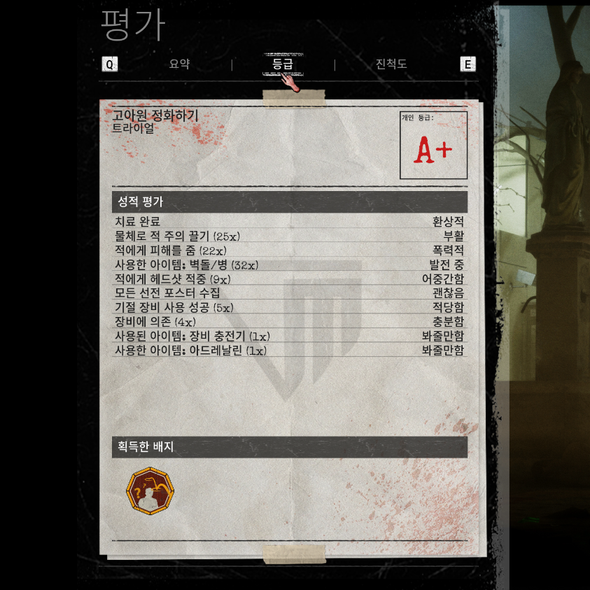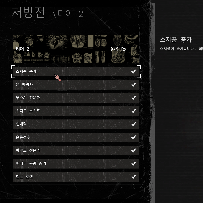 그러므로 아웃라스트 트라이얼에서 처방전은 장비보다 선행 학습해야 할 패시브 기술이며, 트라이얼 완료 시에 A+등급의 높은 성적을 받기 위한 첫걸음입니다. 반면에 장비의 특성을 더 선호하는 분들이라면, 티어 2의 '소지품 증가'까지 배운 후에 전략적으로 스킬을 분배해도 괜찮습니다.