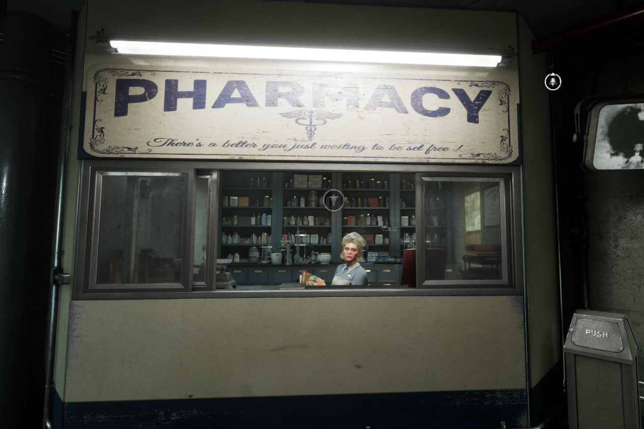 게임을 마치고 엘리베이터에서 내릴 때마다, 정면에는 간호사 복의 NPC가 보입니다. 간판에는 'PHARMACY'라는 단어가 적혀있고, 1층에 위치한 장소라서 특히 눈에 띄는 장소입니다. 이곳이 바로 아웃라스트 트라이얼(Outlast Trials)의 처방전(Prescription) 패시브 기술(Passive Skill)을 배울 수 있는 곳입니다.