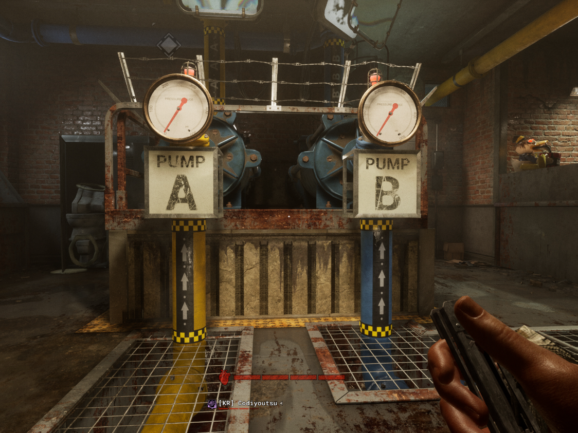 올바르게 이어진 파이프 끝에 다다르게 되면, 좌우로 돌릴 수 있는 밸브 앞에 버튼이 뜹니다. 이때 바로 펌프 밸브를 돌리는 것보다, 소리에 민감한 적들이 주변에 있는지 미리 확인하는 것이 노하우입니다.