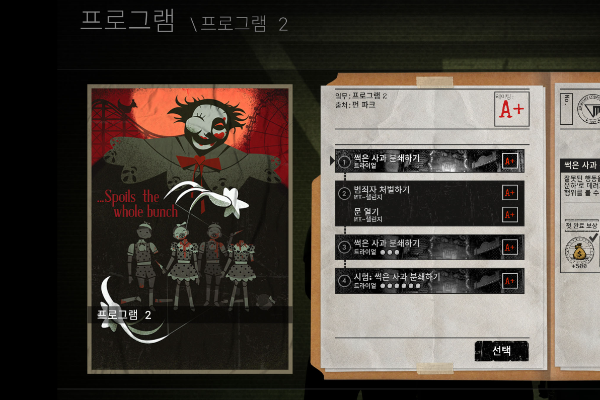 프로그램 1(Program 1)은 경찰서를 배경으로 하며, 메인 보스인 리랜드 코일(Leland Coyle)이 등장합니다. 마지막에 밀고자를 감전시키기 위해 레버를 계속 당겨야 되는데, 코일은 걸음 속도가 빠르고 제압에 능하기 때문에 기절 장비인 연막 지뢰 없이는 클리어하기 어렵습니다.