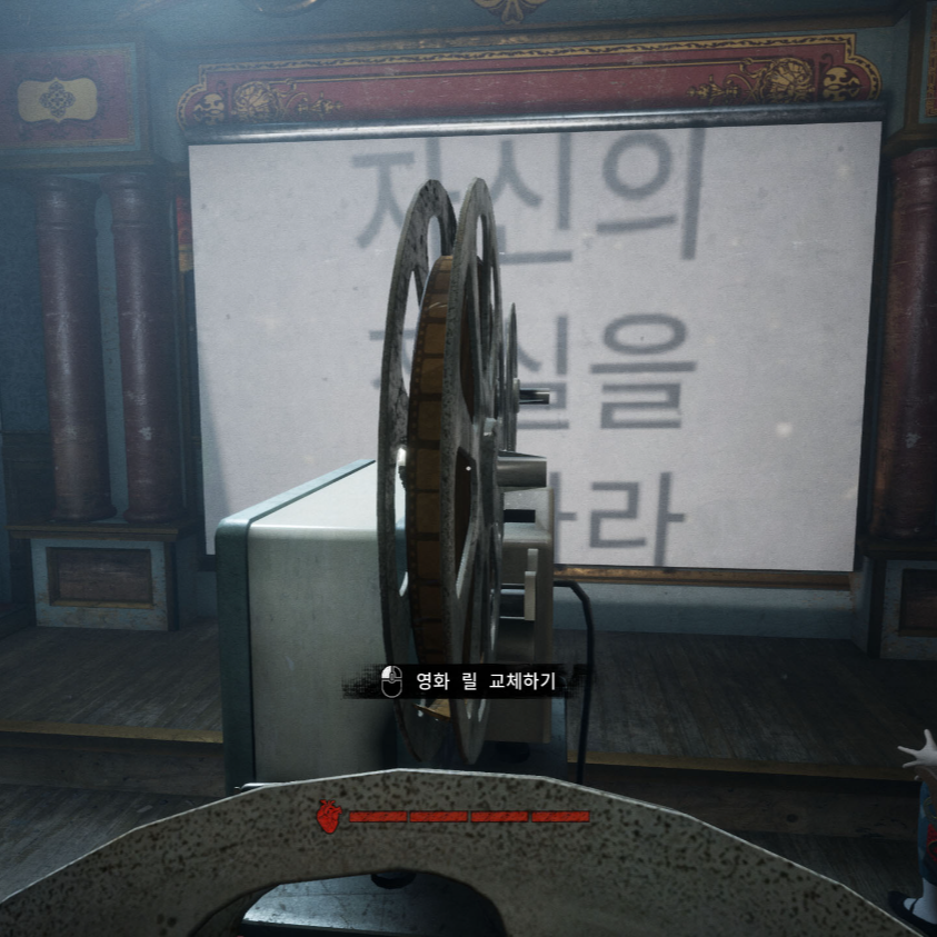 주파수를 모두 조정하여 수리를 마쳤다면, 왼쪽방에 위치한 상영관으로 릴을 든 채 가줍니다. 실내에는 주변을 돌아다니는 적이 한 명 있으며, 지뢰 덫이 있는 곳으로 유인하여 안전히 릴을 교체하면 좋습니다.