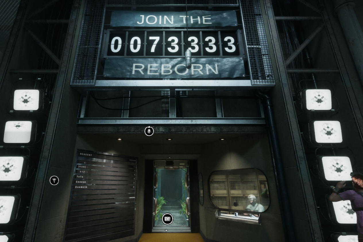 'JOIN THE REBORN'이라는 문구와 함께, 아래에는 정원으로 들어가는 입구가 보입니다. 이곳이 피실험체 해방 프로토콜을 진행할 수 있는 장소이며, 우측에 있는 NPC에게 대화를 걸면 시작할 수 있습니다.