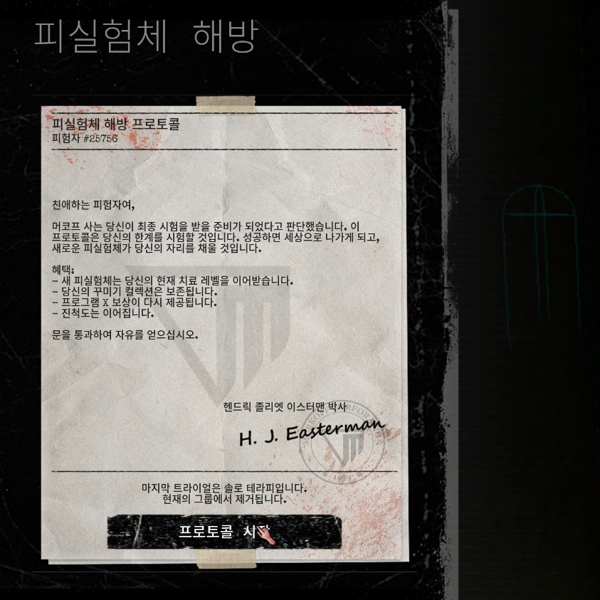 만약에 여러분이 프로그램 X(Program X) 임무를 모두 완수하지 않은 상태라면, '자유를 획득하세요.'라는 문구와 함께 화면에 해방 토큰이 필요하다는 안내 표시가 나타납니다. 참고로 임무 종이에는 헨드릭 졸리엣 이스터맨 박사(H.J Easterman)의 편지와 함께 머코프 사의 최종 시험이 있다고 적혀있습니다.