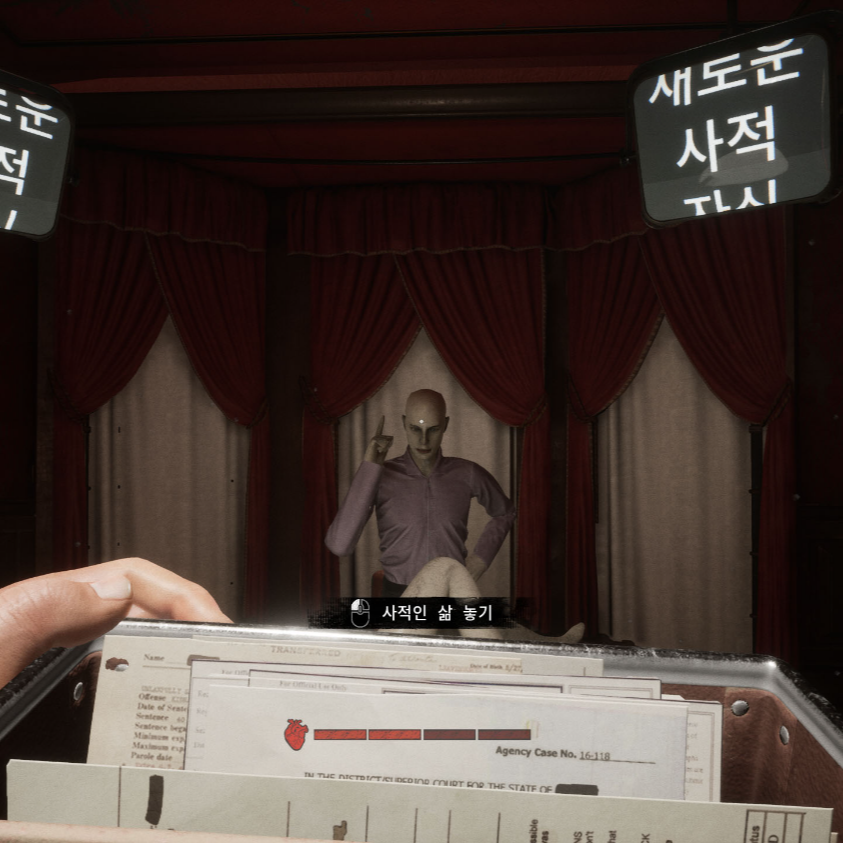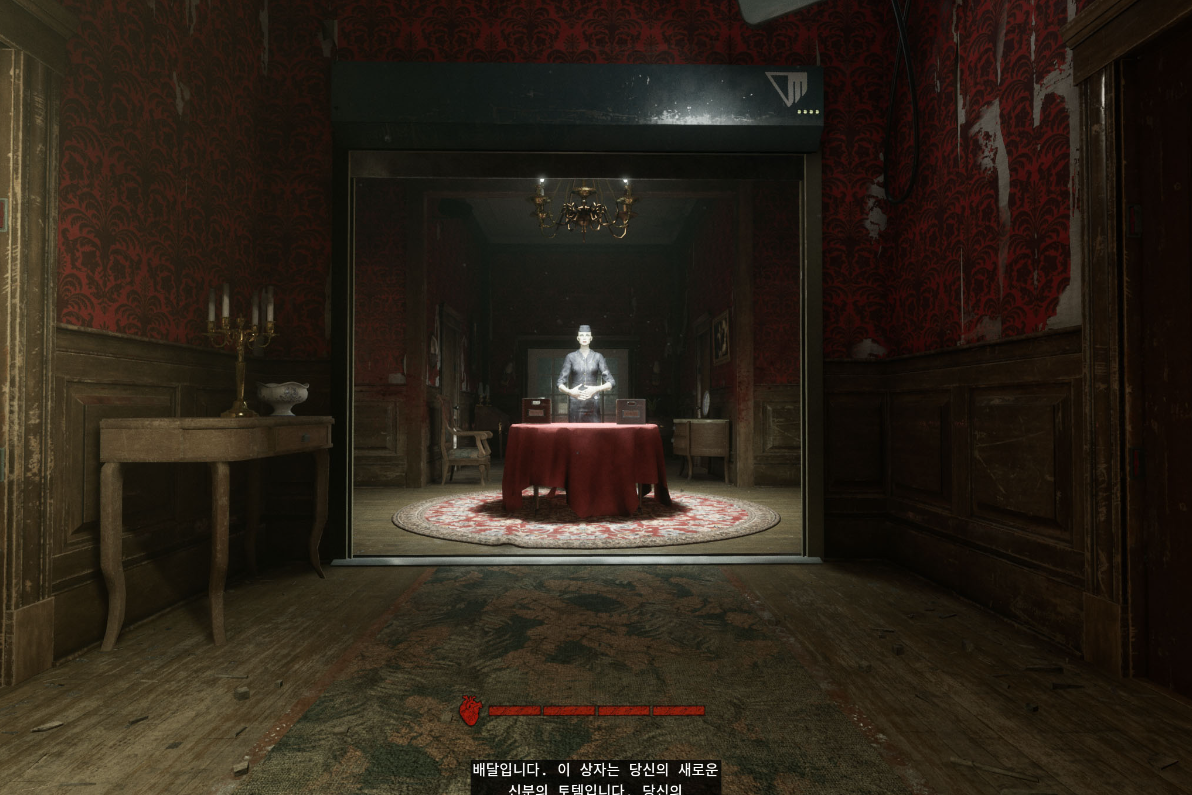 시작 지점에 위치한 테이블 위의 양쪽에는 두 가지의 서류 상자가 놓여있습니다. 이 상자를 게임 속에서 '당신의 새로운 신분 토템'으로 부르는데, 왼쪽은 '사적인 삶', 오른쪽이 '공적인 삶'입니다. 이 상자들을 좌우 각 끝 방에 안전히 놓아두고 오는 것이 첫 번째 임무입니다.