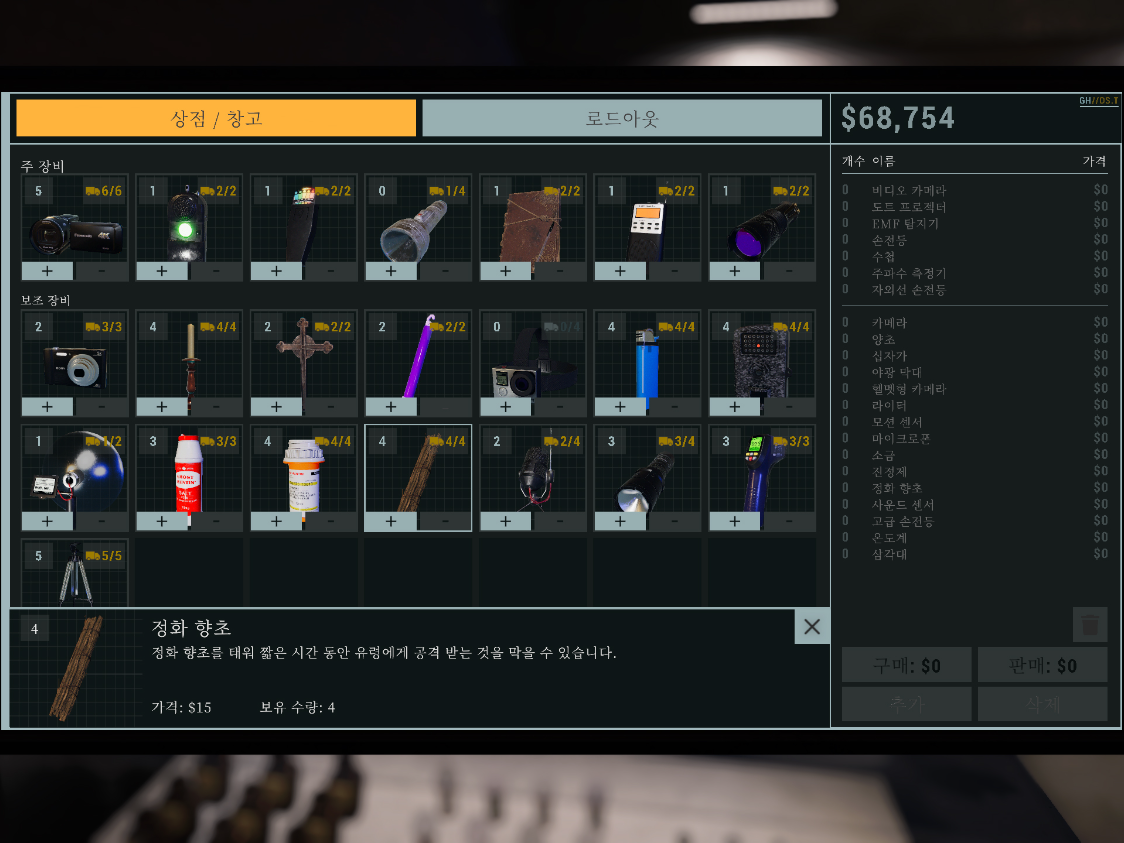 게임이 새롭게 업데이트된 이후의 설명으로, 사진을 보면 더욱 이해하기 쉽습니다. 로비의 상점/창고에서 정화 향초를 $15에 최대 4까지 구매가 가능합니다. 이때 정화 향초의 설명을 보면, '짧은 시간 동안 유령의 공격을 막을 수 있다.'라고 적혀 있습니다.