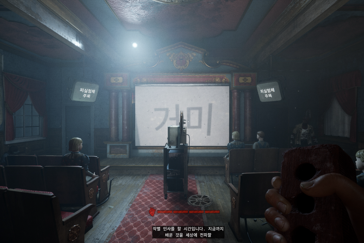 아웃라스트 트라이얼에는 각 방마다 특이한 구조의 영화관이 있는데, 이곳은 세뇌를 하는 공간이면서 동시에 쇼를 좋아하는 구스베리의 무대이다. 영화 릴을 교체하면, '작별 인사를 할 시간입니다. 지금까지 배운 것을 세상에 전파하세요.'라는 독특한 멘트가 나온다.
