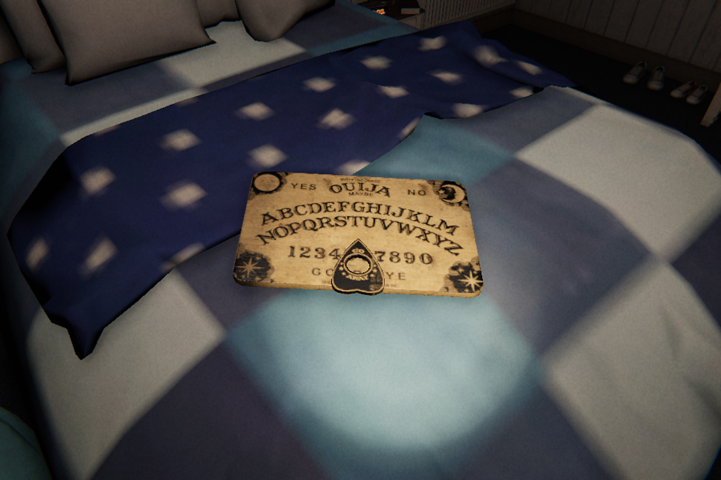 실내에서 위자보드를 발견했다면, 방의 위치나 조명 전원과 관계없이 보드가 있는 곳에서 질문을 할 수 있습니다. 이때 플레이어는 인게임 음성 채팅으로 질문이 가능하며, 유령이 답변 시에 사진처럼 보드 속의 화살표가 움직이면서 한 단어씩 보여줍니다.