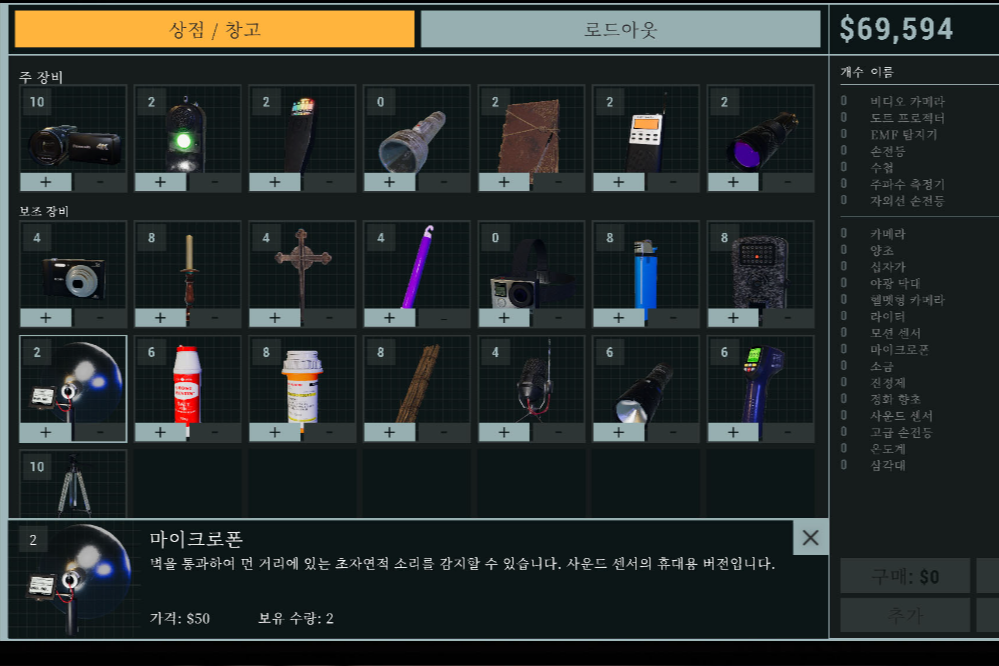 게임 초반에 플레이어 4명은 서로 다른 장비를 들고 유령의 증거를 찾기 위해 측정을 시작합니다. 이때 마이크로폰은 다른 장비들보다 유령의 위치를 찾는 속도가 빠릅니다. 특히 'Prison'처럼 넓은 실내 공간 및 방의 개수가 많은 맵에서는 마이크로폰의 데시벨 수치가 중요한 역할을 합니다.