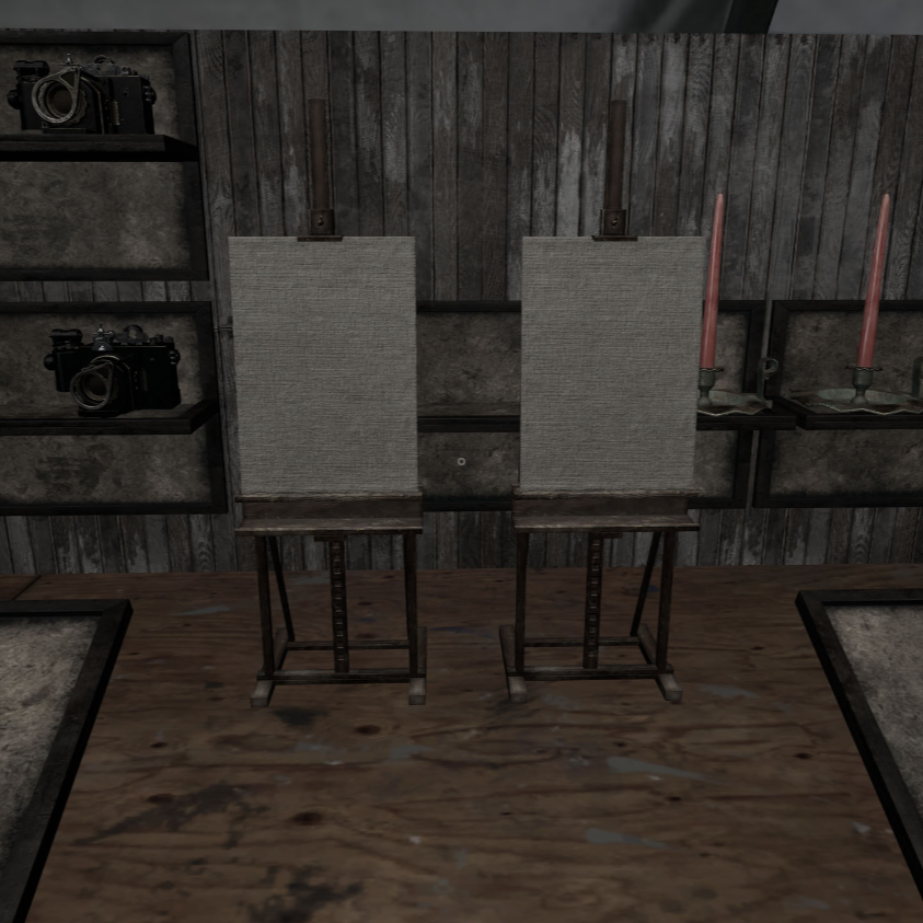 참고로 사진처럼 이젤 캔버스가 두 개일 경우에는 유령의 동선을 고려하여 3m 정도의 거리를 두고 설치하는 것이 좋습니다. 이때 주변에는 EMF, 촛불, ESG, 온도계를 두고 유령의 상호작용을 기다리되, 증거가 나온 장비들은 모두 밖으로 빼줍니다.