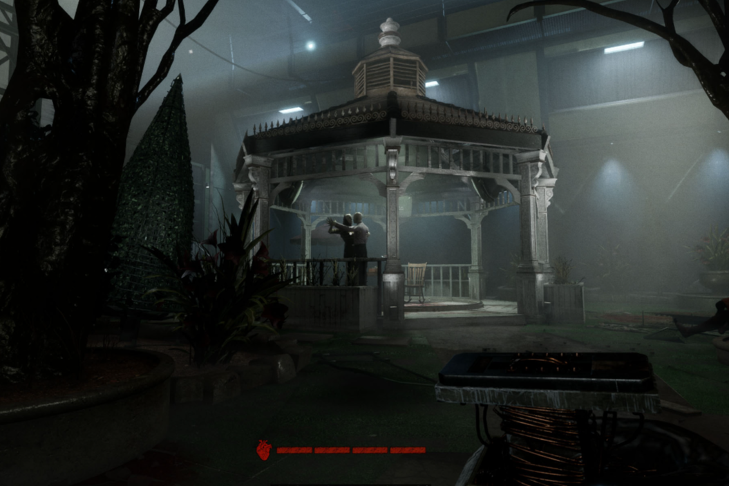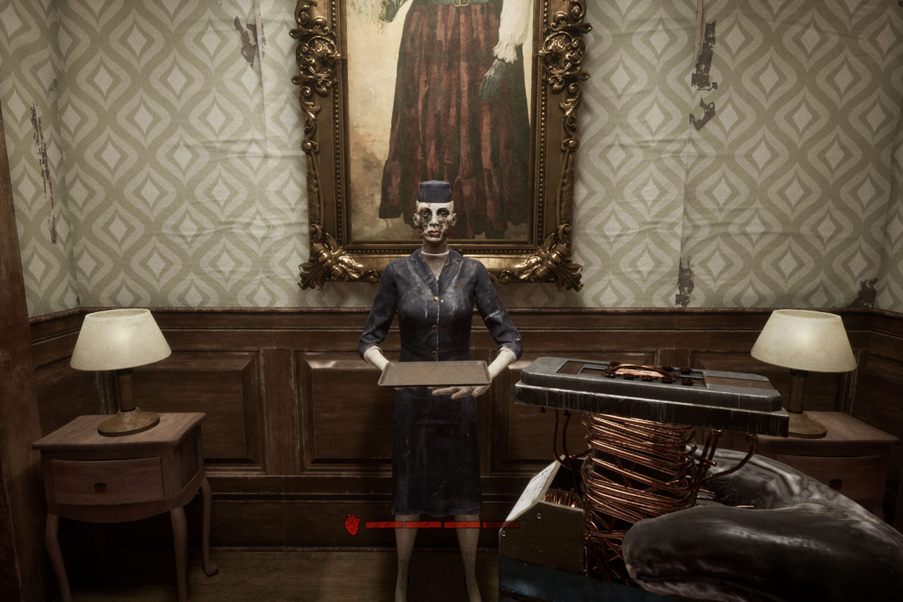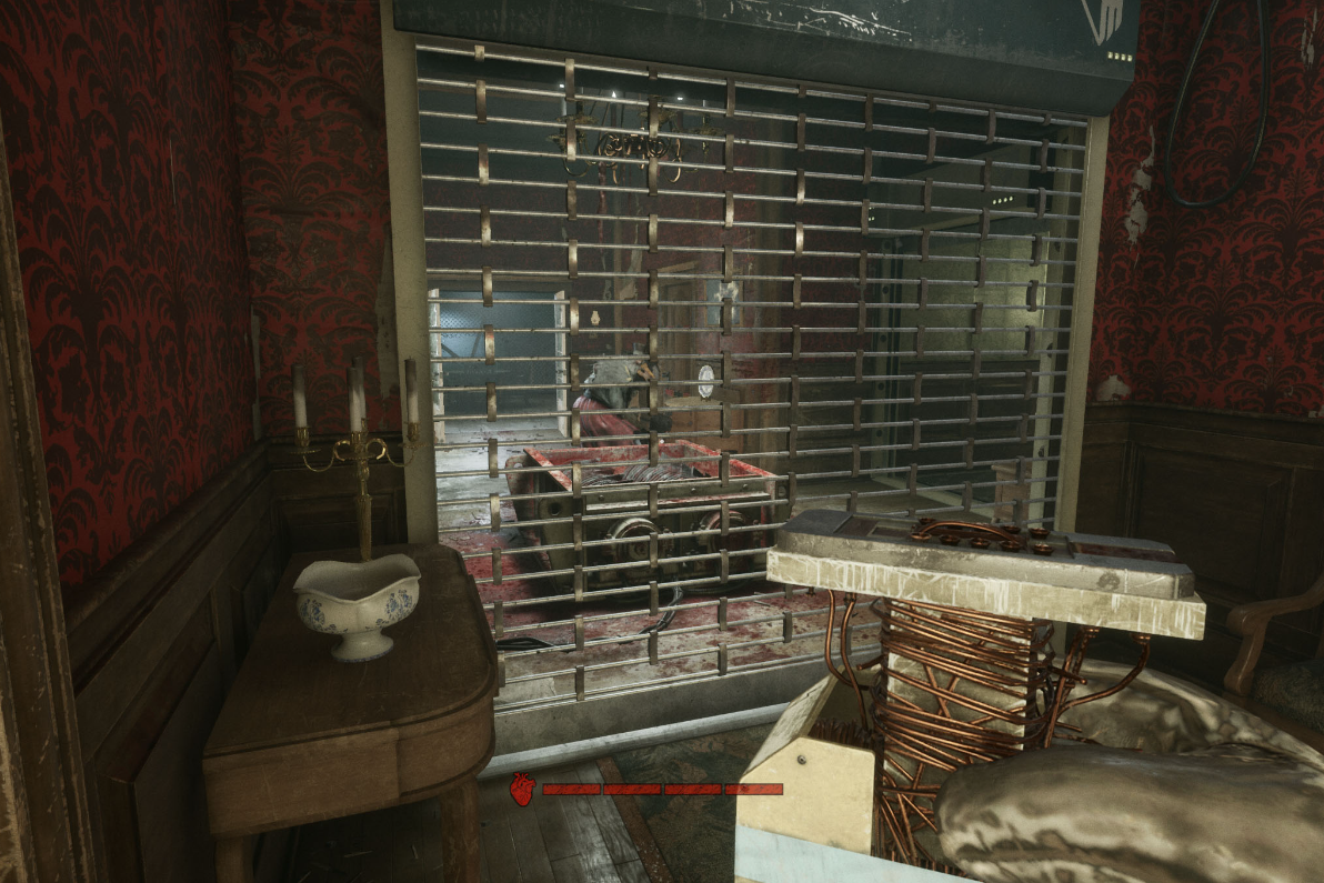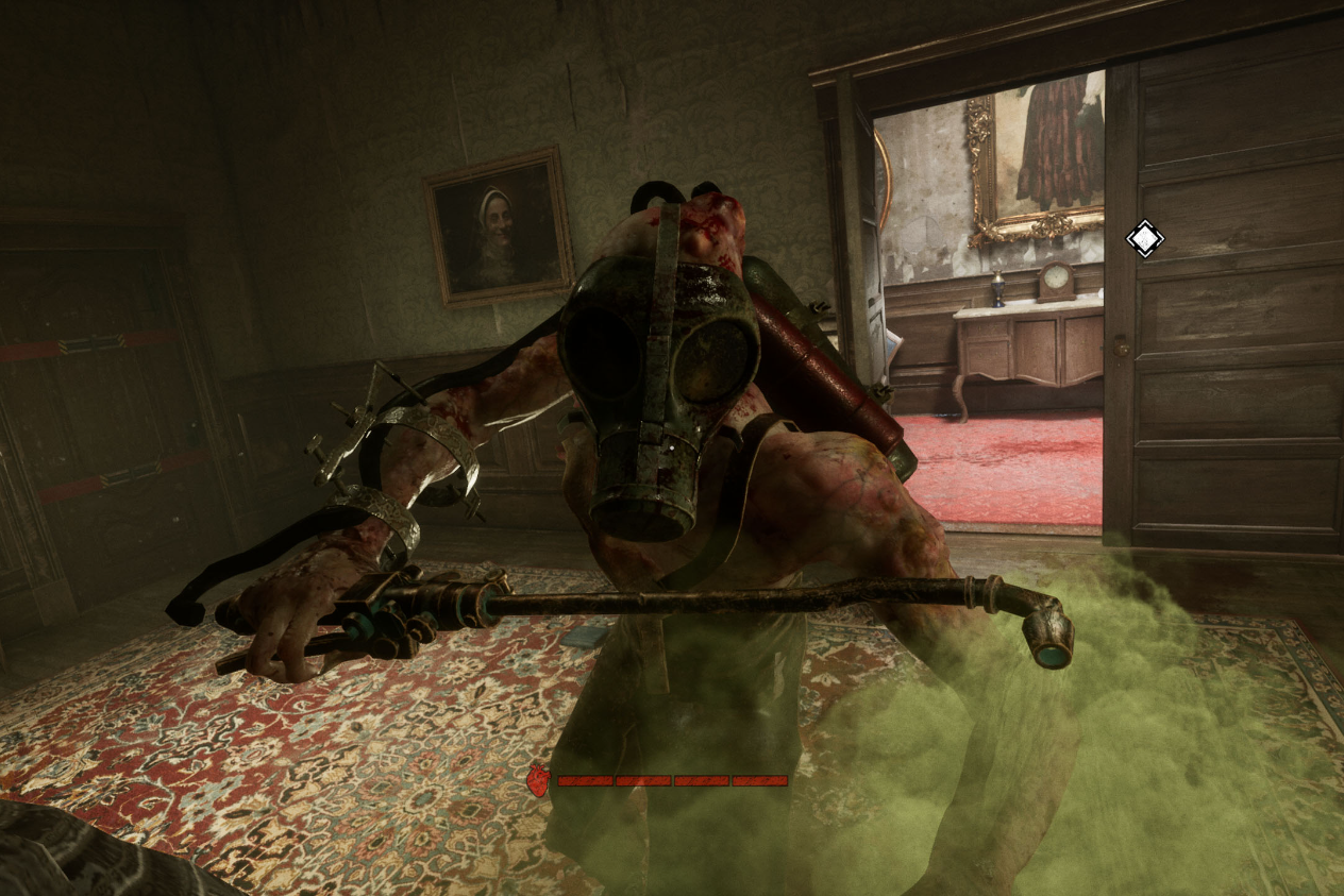 왼쪽 복도 끝에 다다르면, 방독면을 착용한 적이 플레이어의 손을 붙잡고 강제로 가스 공격을 합니다. 이때 캐릭터의 정신력이 모두 떨어지면서 공간이 마치 혈관을 두른 듯이 바뀌며, 정장을 입은 '스키너맨'이 나타납니다.