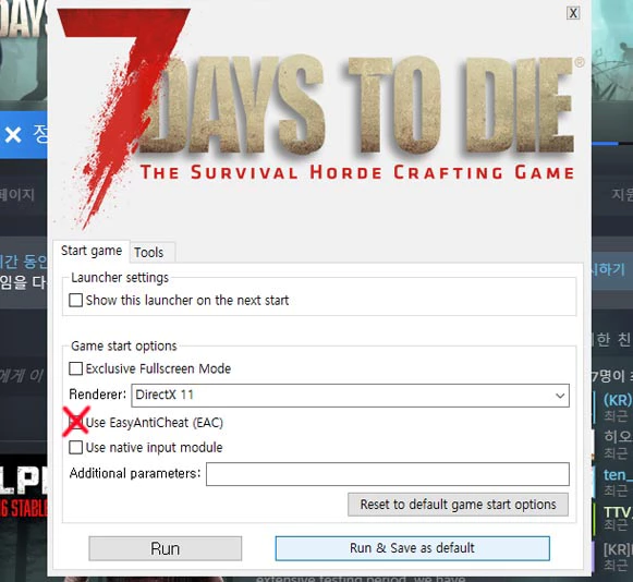 다음으로 Start game options의 Use EasyAnticheat(EAC) 항목을 제거한 후에 Run & Save as default를 클릭하시면, 곧바로 게임이 시작됩니다.