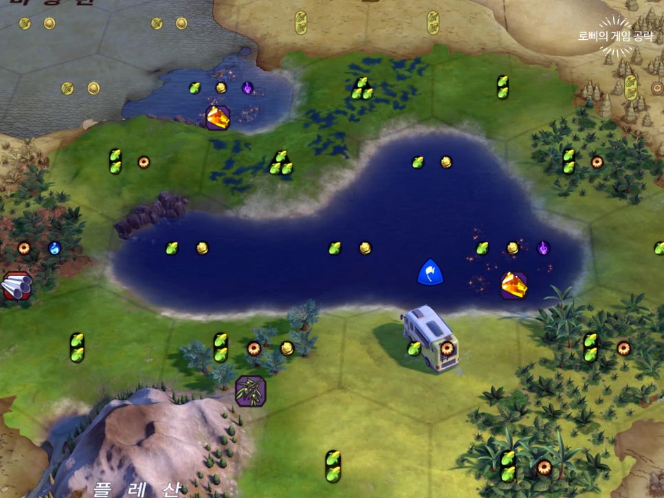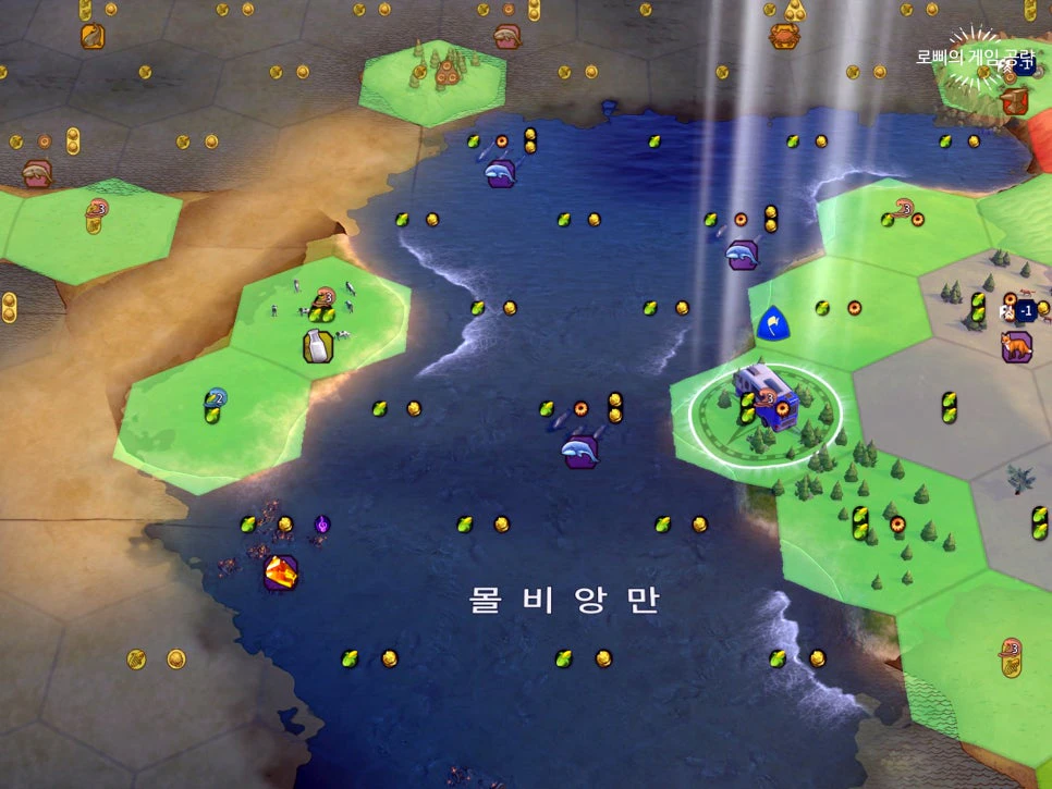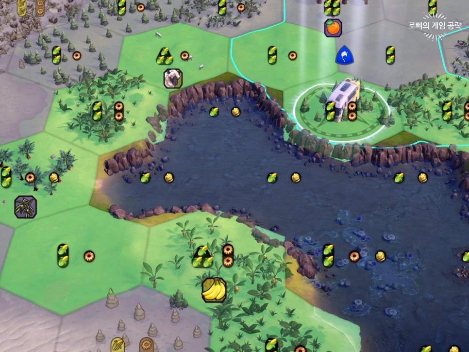 섬 혹은 다른 대륙이 현재 대륙으로부터 한 칸 차이로 떨어진 해안타일이 바로, 문명6 금문교 건설이 가능한 조건입니다. 주로 첫 도시를 담수와 전략 및 사치 자원을 얻기 위해서 강 인근에 건설할 때가 많은데, 초기 정찰병을 활용해 위와 동일한 지형 주변을 선점하는 것이 노하우입니다.
