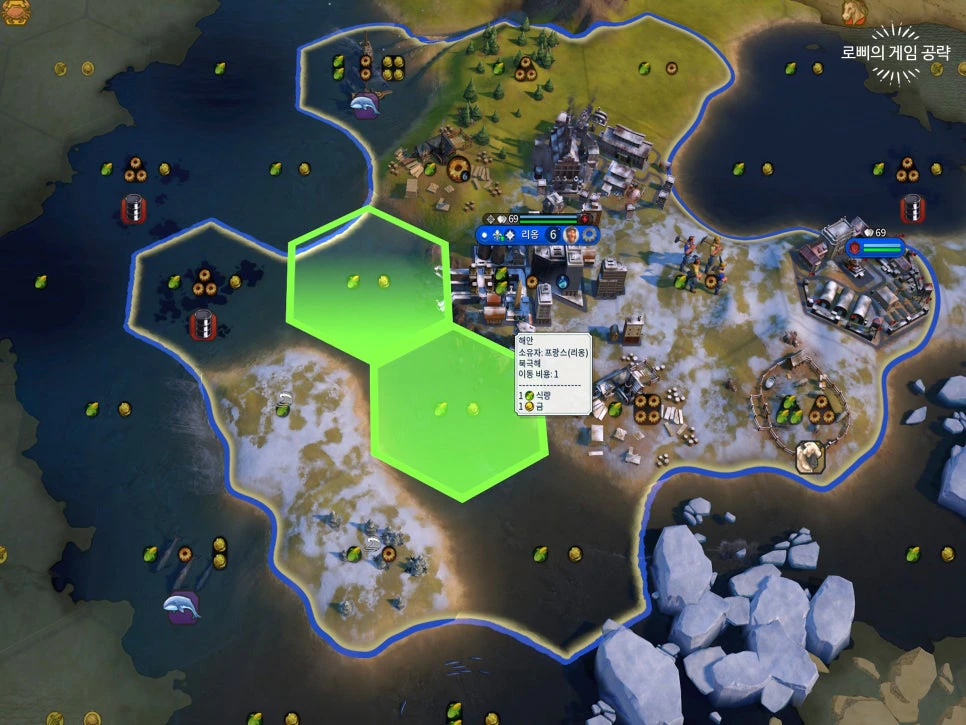 또한 인구 성장 속도가 높아진 상태라면, 완공을 위한 턴 수를 계속 점검하면서 주둔지나 항만까지 골드로 확장해 줍니다. 그러면 보통 35 턴 이내로 완공이 가능하며, 아이콘을 클릭하면 건설 가능한 위치가 해안 타일 인근에 나타나게 됩니다.