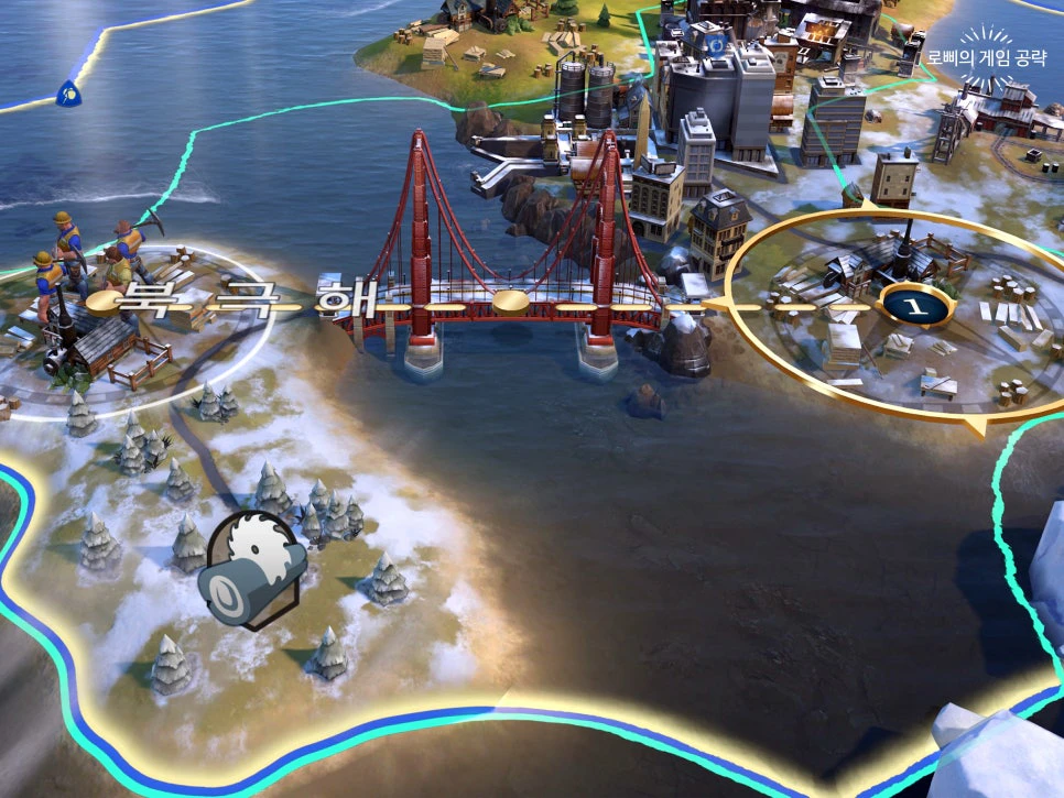 해당 대륙이 수도에서 멀리 떨어진 외곽에 위치하고 있거나, 다른 대륙에 포함되어 있을 때에는 사회 정책을 활용해 생산력을 높이면 좋습니다. 또한 도시의 인근 생산량을 확인한 이후에 산업구역을 우선으로 건설하고, 건설자를 통해 광산을 지어서 금문교의 생산속도를 높여줍시다.
