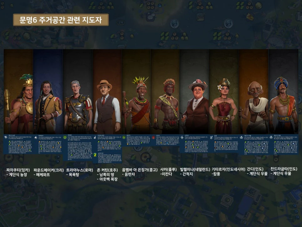 다음은 문명6에서 주거공간을 늘리기 쉬운 지도자들입니다.