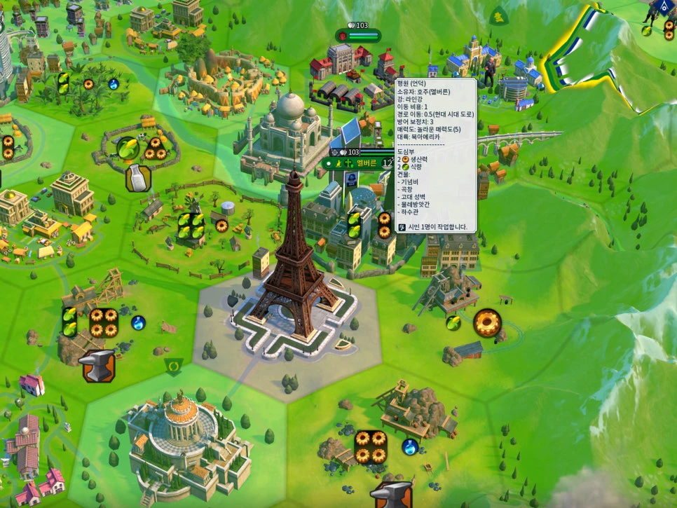 매력도가 낮은 곳이나, 타일이 협소한 지역에 도시를 세운 분들이라면, 게임 후반 불가사의인 '에펠탑'을 건설하면 좋습니다. 또한 위대한 기술자를 활성화하여 도심이 보유한 타일의 매력도를 높일 수 있습니다.