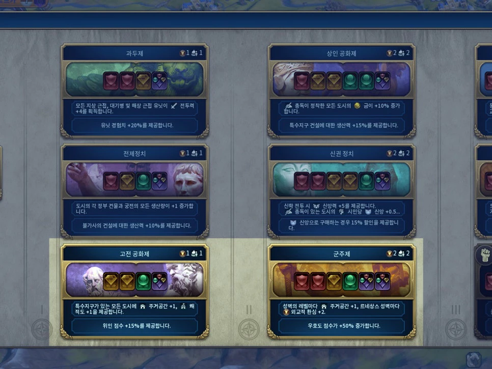 플레이어 정부마다 각기 다른 사회제도 카드 슬롯이 확장되는데,