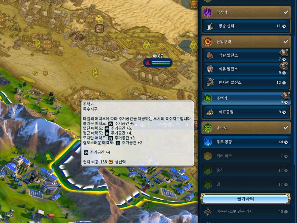 주택가를 통해 더 많은 주거공간을 확보하기 위해서는 주변 타일의 매력도가 높아야 됩니다. 주로 자연경관이 있는 타일 주변이나, '산, 숲, 열대우림이 우거진 초원'처럼 자연과 어우러진 곳이 다른 평원보다 매력도가 높습니다.