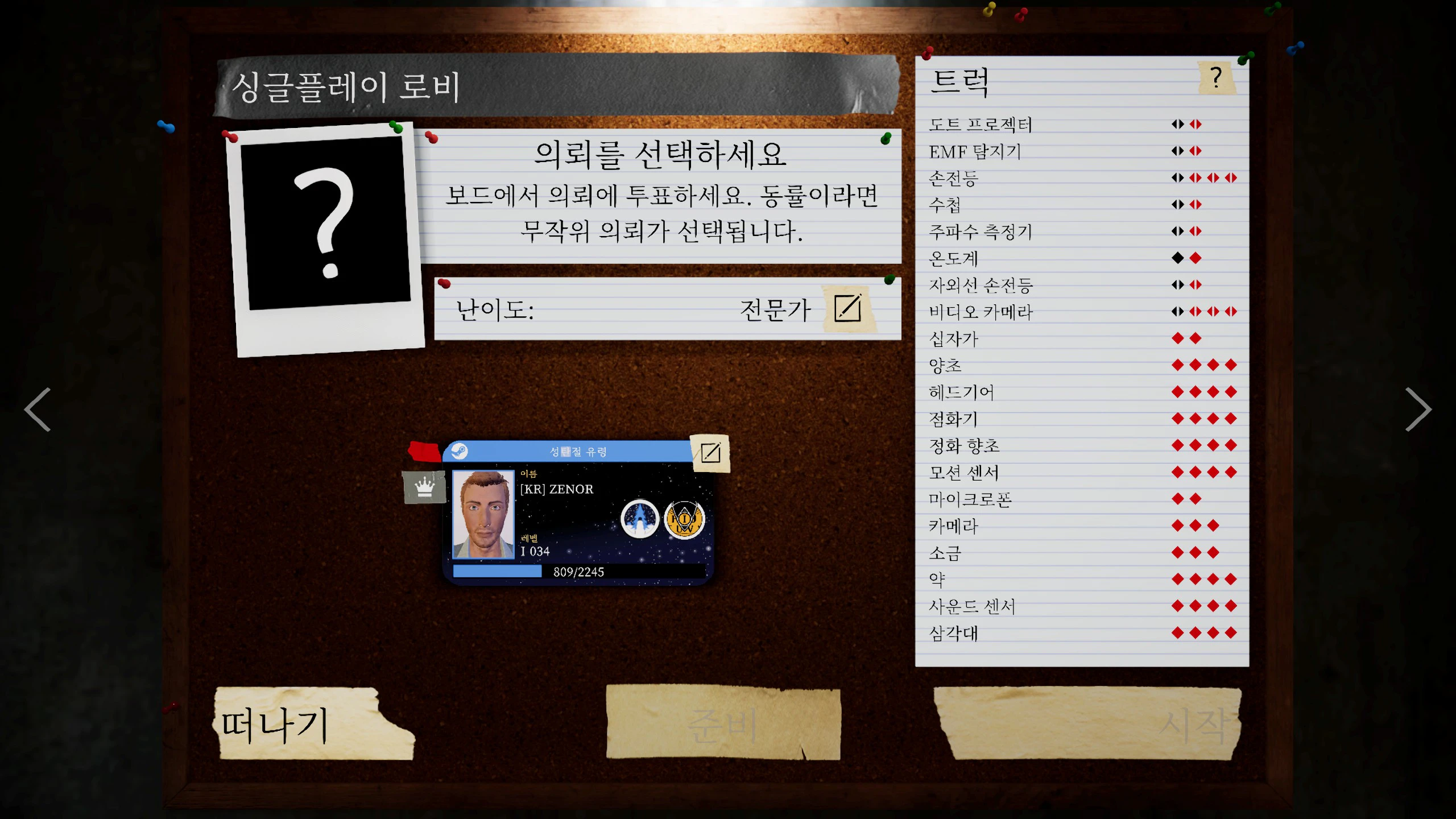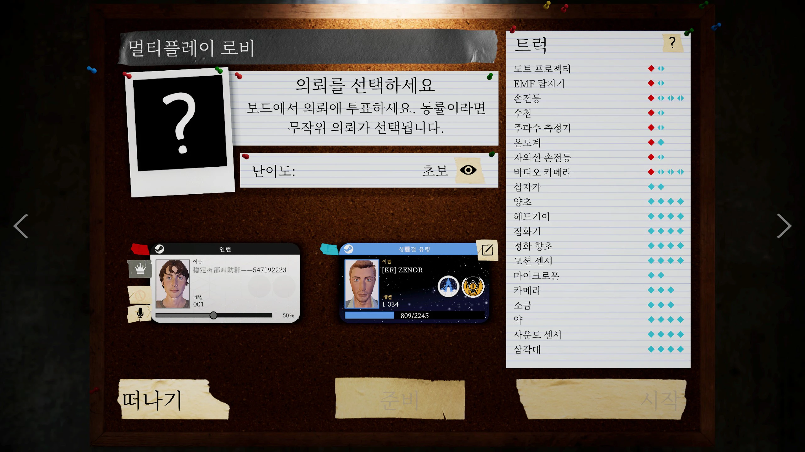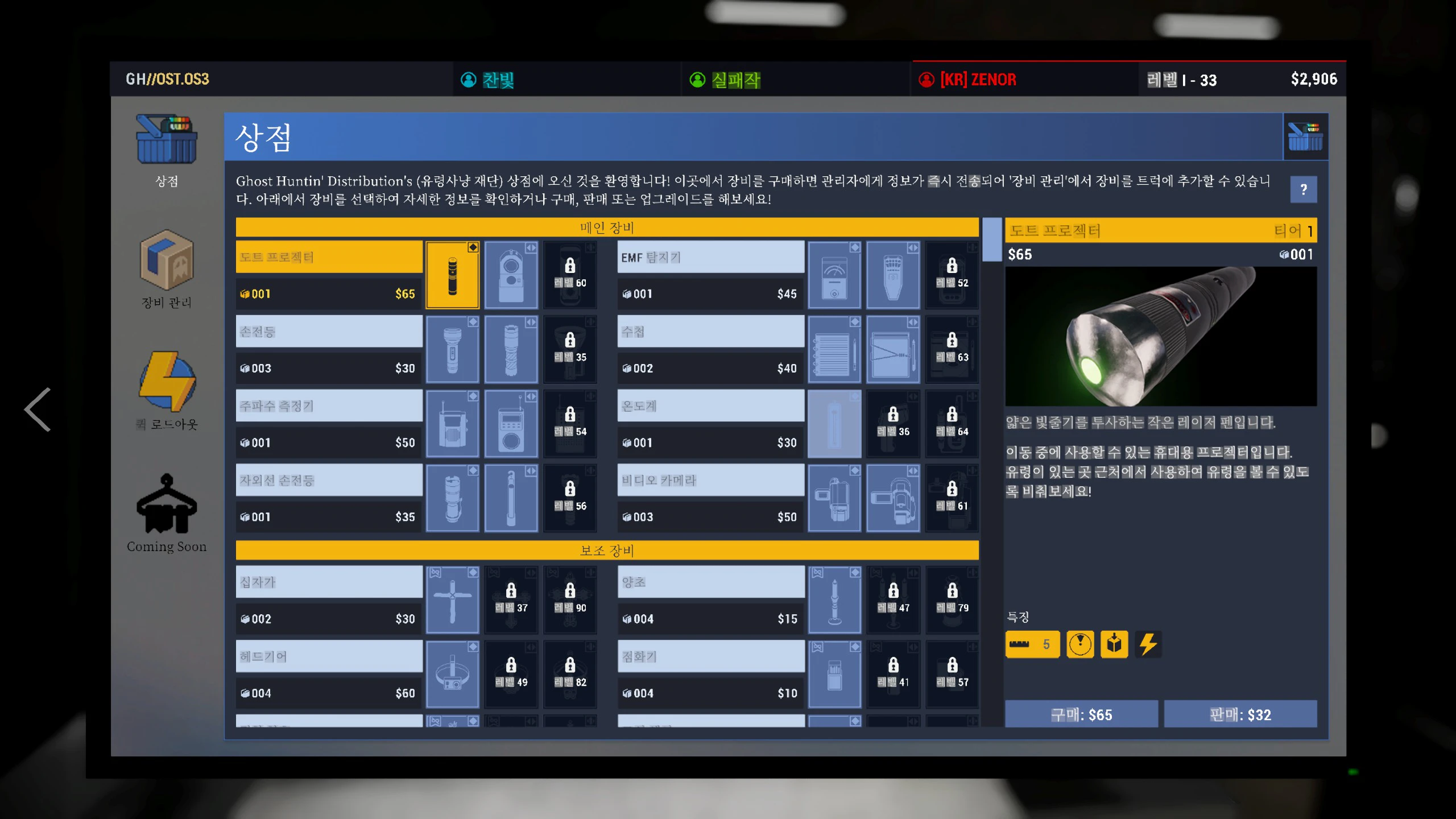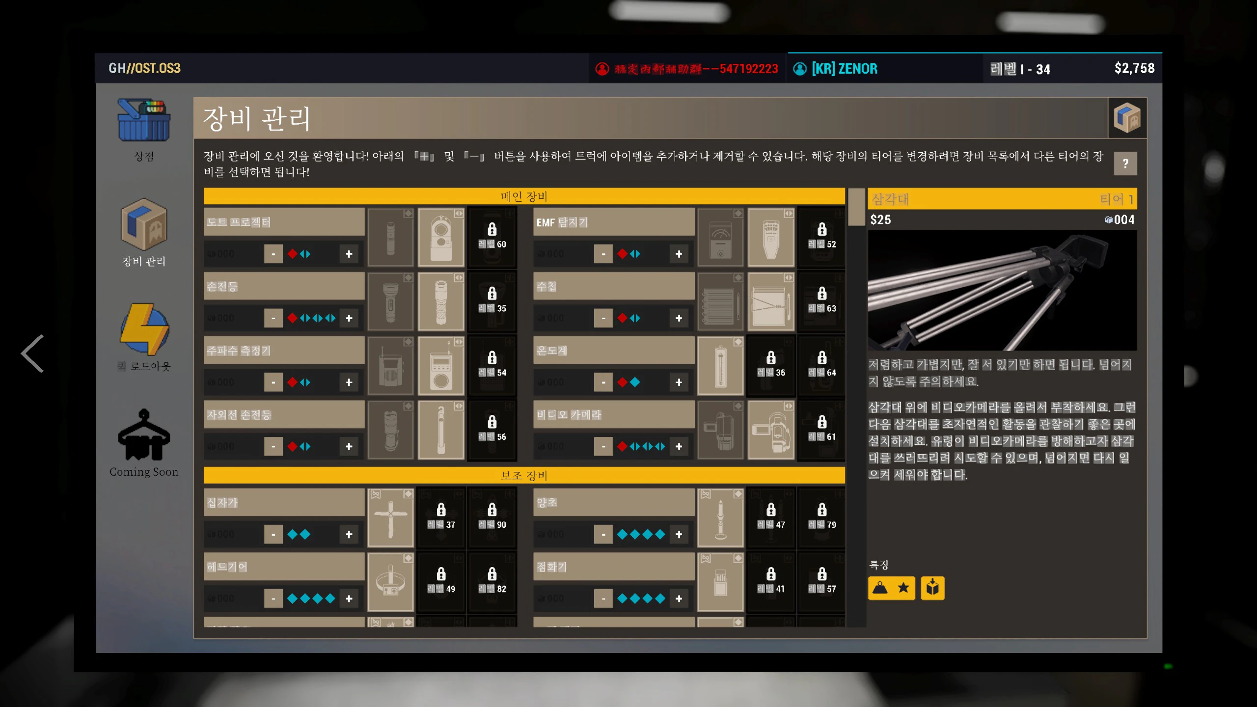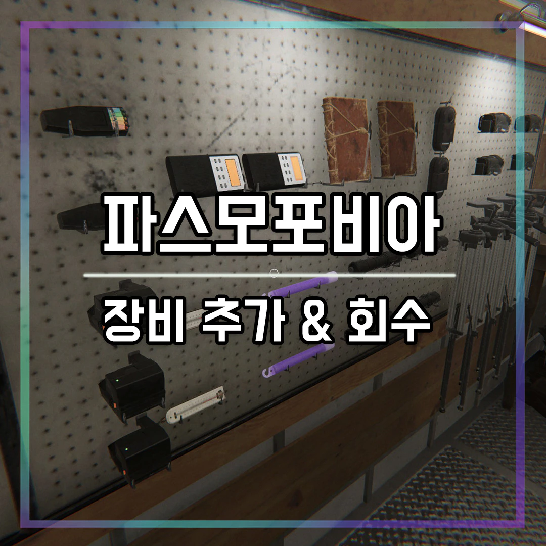 이제 장비 관리 항목을 들어가면, 상단에 플레이어의 이름 색감과 동일한 장비들이 추가된 것을 확인하실 수 있습니다. 참고로 파스모포비아는 게임에서 고스트의 공격에 당하면, 아이템의 일부분 혹은 전부를 잃기 때문에 팀원과 상의하고 장비를 조화롭게 배치해야 됩니다.