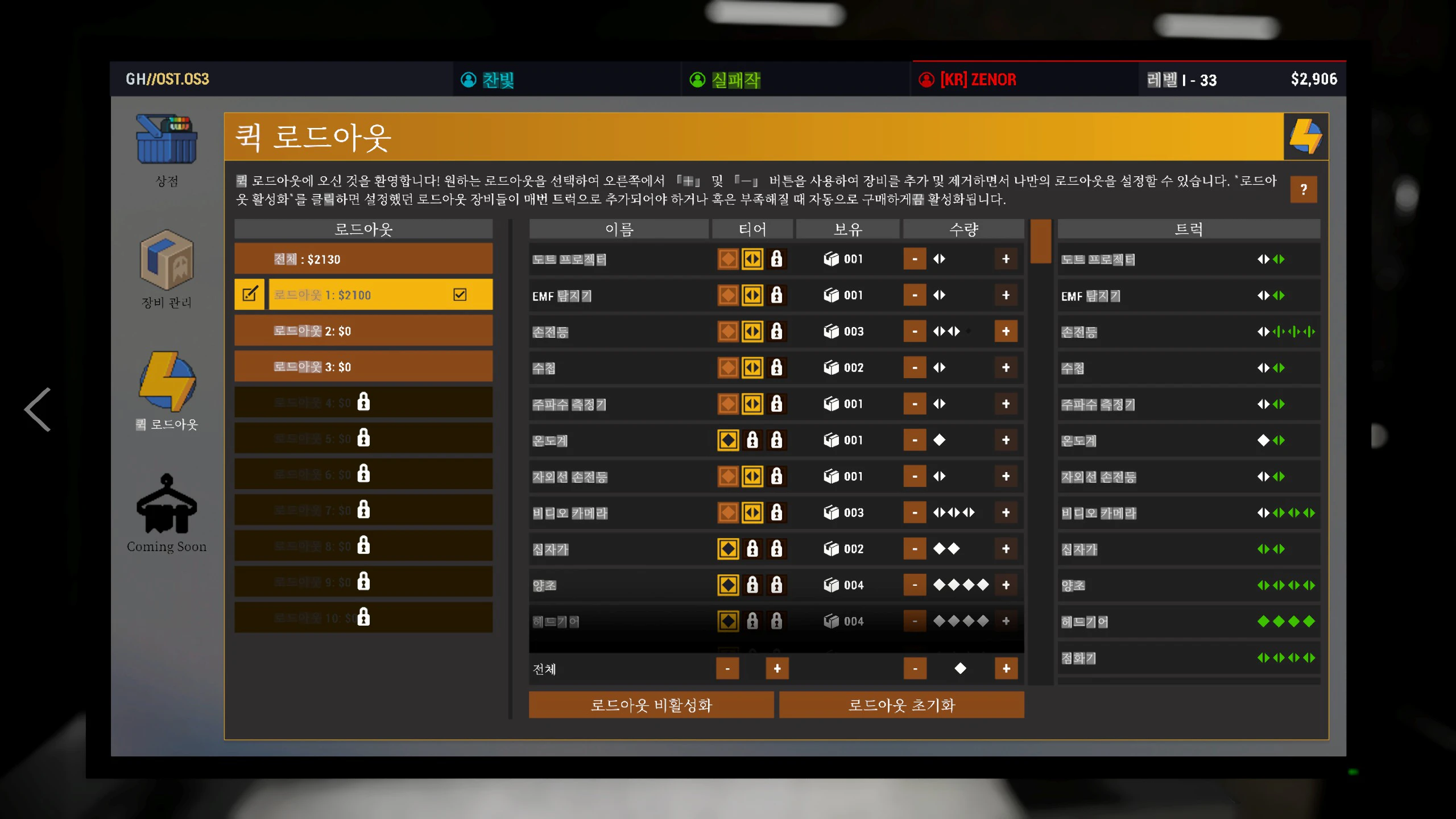 로비에 놓인 모니터를 바라보게 되면, 상점이 나옵니다. 상점에서는 장비를 레벨에 따라 업그레이드하거나, 구매할 수 있습니다. 그러나 구매를 했음에도 차량에 장비가 추가되지 않아서, 간혹 게임을 재시작하는 분들이 많습니다. 그 이유는 장비 관리 항목에서 따로 추가해야 되기 때문입니다.