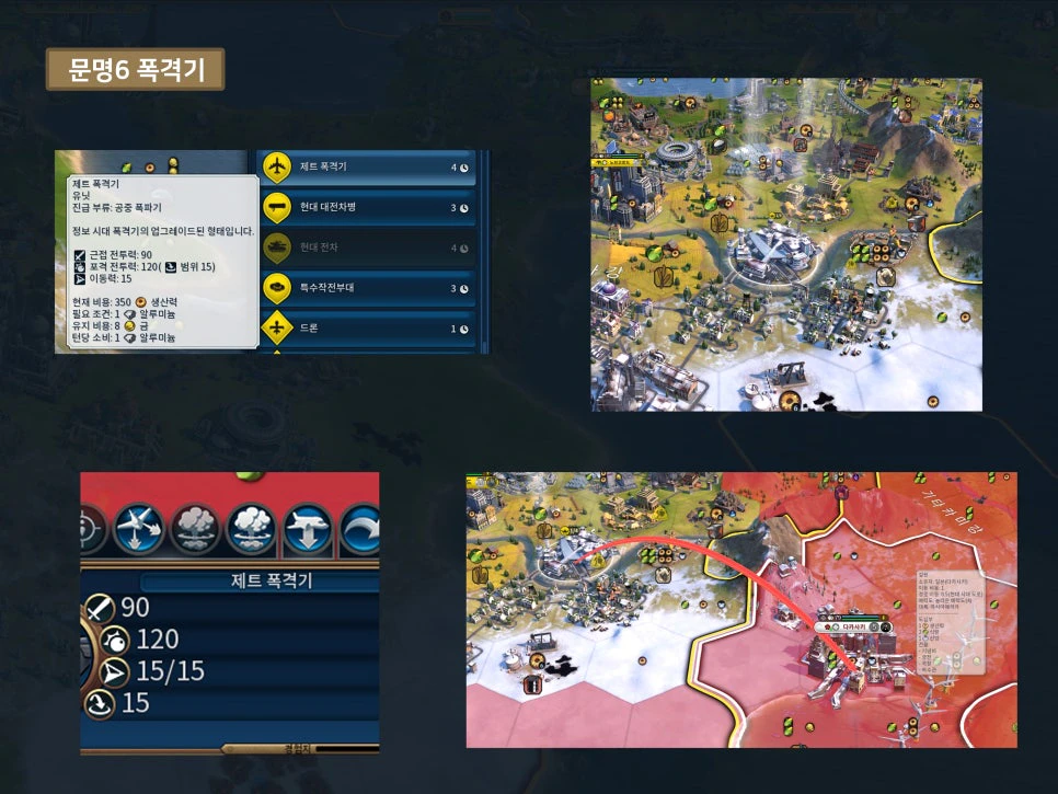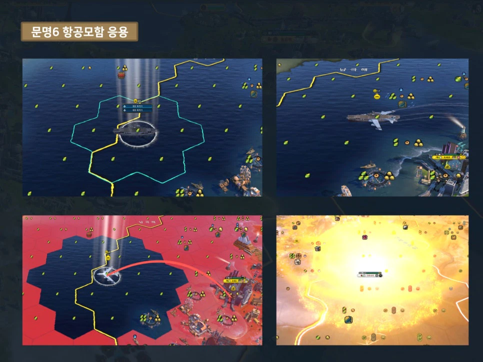 세 번째는 '항공모함'에 제트 폭격기를 승선시켜서, 항공 유닛이 갖춘 공격 범위 한계의 단점을 없애고 핵을 발사하는 방법입니다. 그러나 게임 지형이 바다가 넓은 대륙 형태가 아닌, 판게아거나 적의 해상 병력이 월등히 많을 경우에는 유닛 손실의 위험이 있어서 턴마다 컨트롤이 필요합니다.