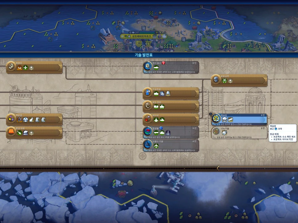 도시에서 원자폭탄 및 수소폭탄을 생산하기 위해서는 기술 발전표의 핵분열과 핵융합의 연구가 완료된 상태여야 됩니다. 사진처럼 로봇 공학과 핵융합 중에 선택의 기로에 놓일 수 있으며, 이는 전쟁 중에 상대 과학 기술의 진척을 보고 우선순위를 결정해 줍니다.
