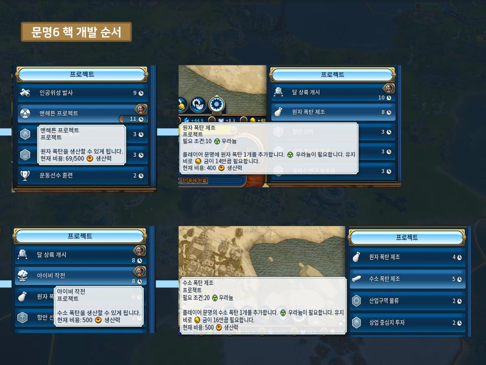핵을 개발하는 순서는 '맨해튼 프로젝트'와 '아이비 작전' 순입니다. 맨해튼 프로젝트는 원자 폭탄, 아이비 작전은 수소 폭탄과 관련되어 있습니다. 보통 전략 자원이 있는 광산 한 곳에서 세 개의 자원이 나오며, 우라늄도 턴마다 3개씩 추가됩니다.
