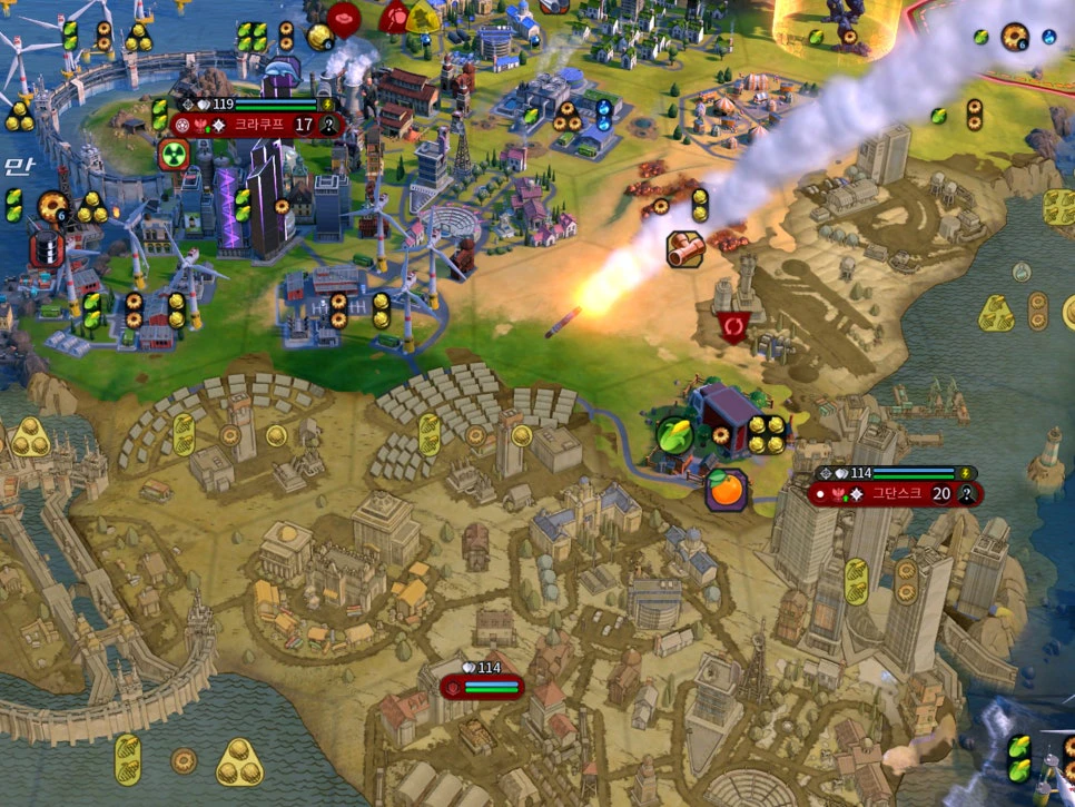 대량 살상무기는 적 도심에 투하되므로, 미래 시대 이전에 전 세계에 대한 시야 확보를 하는 것이 핵심입니다. 따라서 초기 우주 프로젝트인 인공위성 발사를 빠르게 완료하고, 모든 도시의 위치를 파악해 줍니다. 이것이 어렵다면, 잠수함이나 간단한 외교를 통해 상대 문명의 도시 수를 확인해 보는 것도 좋은 공략입니다.