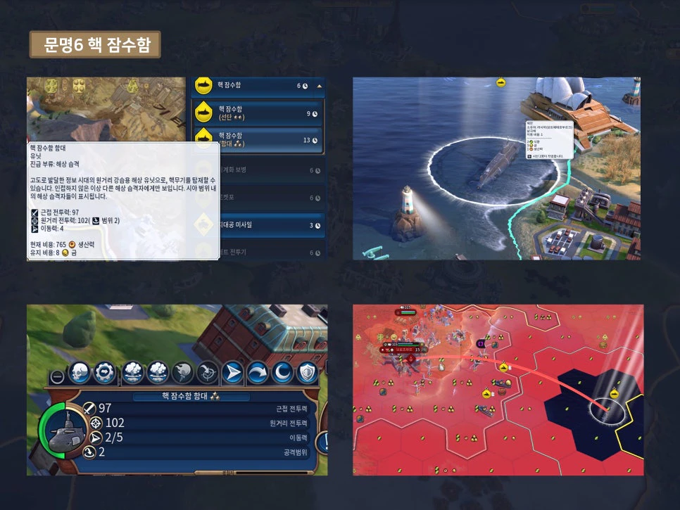 문명 6에서 핵 쏘는 방법은 총 세 가지로, 첫 번째는 해상 유닛인 '핵 잠수함'을 활용하는 것입니다. 해당 잠수함은 원자폭탄이나 수소폭탄을 따로 승선시키지 않아도, 곧바로 발사할 수 있다는 장점이 있습니다.