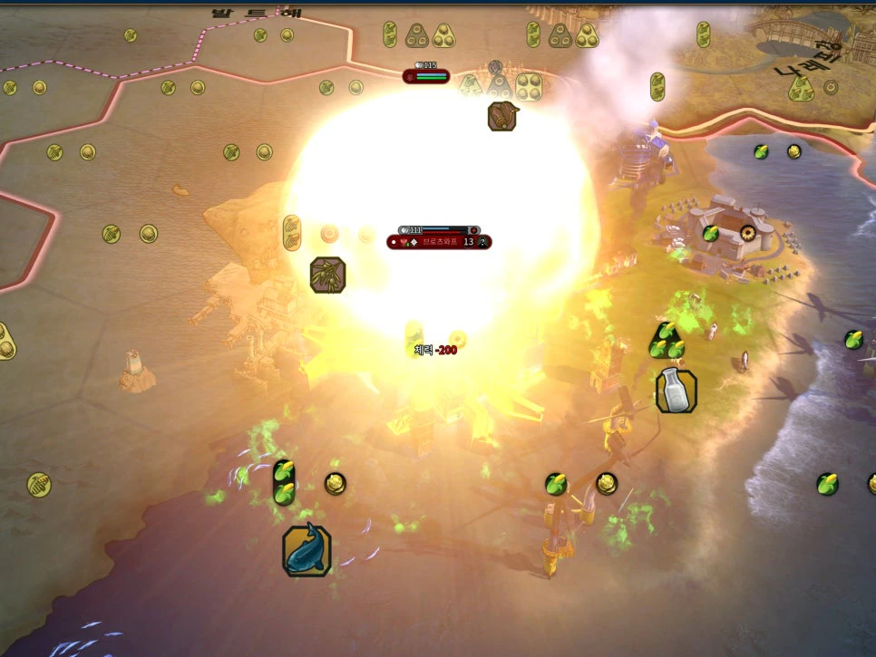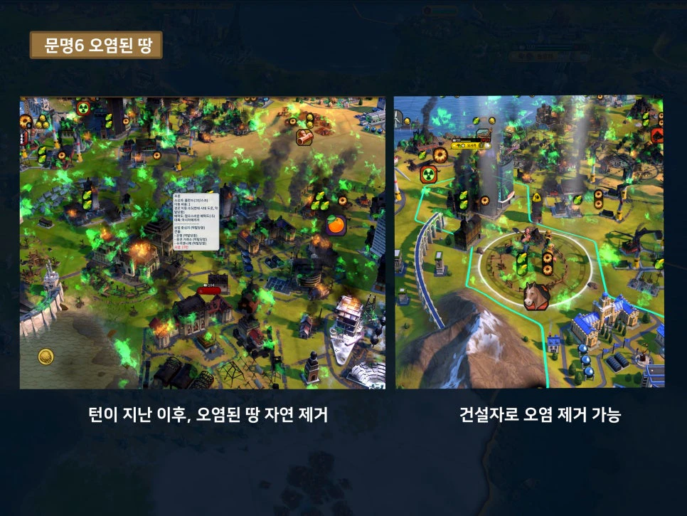 해당 오염된 땅 타일에서는 턴마다 큰 대미지를 입히기 때문에, 유닛이 지나가거나 가만히 있기 어렵습니다. 심지어 핵으로 파괴된 도시는 아군 병력이 점령하지 않은 상태에서는 자동으로 파괴되거나 사라지지 않습니다.