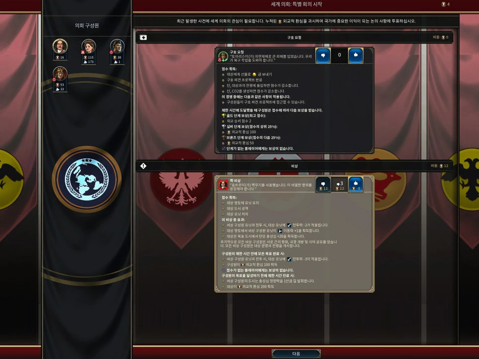 가끔은 세계 의회 주제로 대량 살상무기를 선택 국가와 동일하게 설정하는 것이 있습니다. 상대방의 전투력이 더 높은 상태에서 이러한 조건이 통과되면, 전략 운용이 어려워질 수 있습니다.